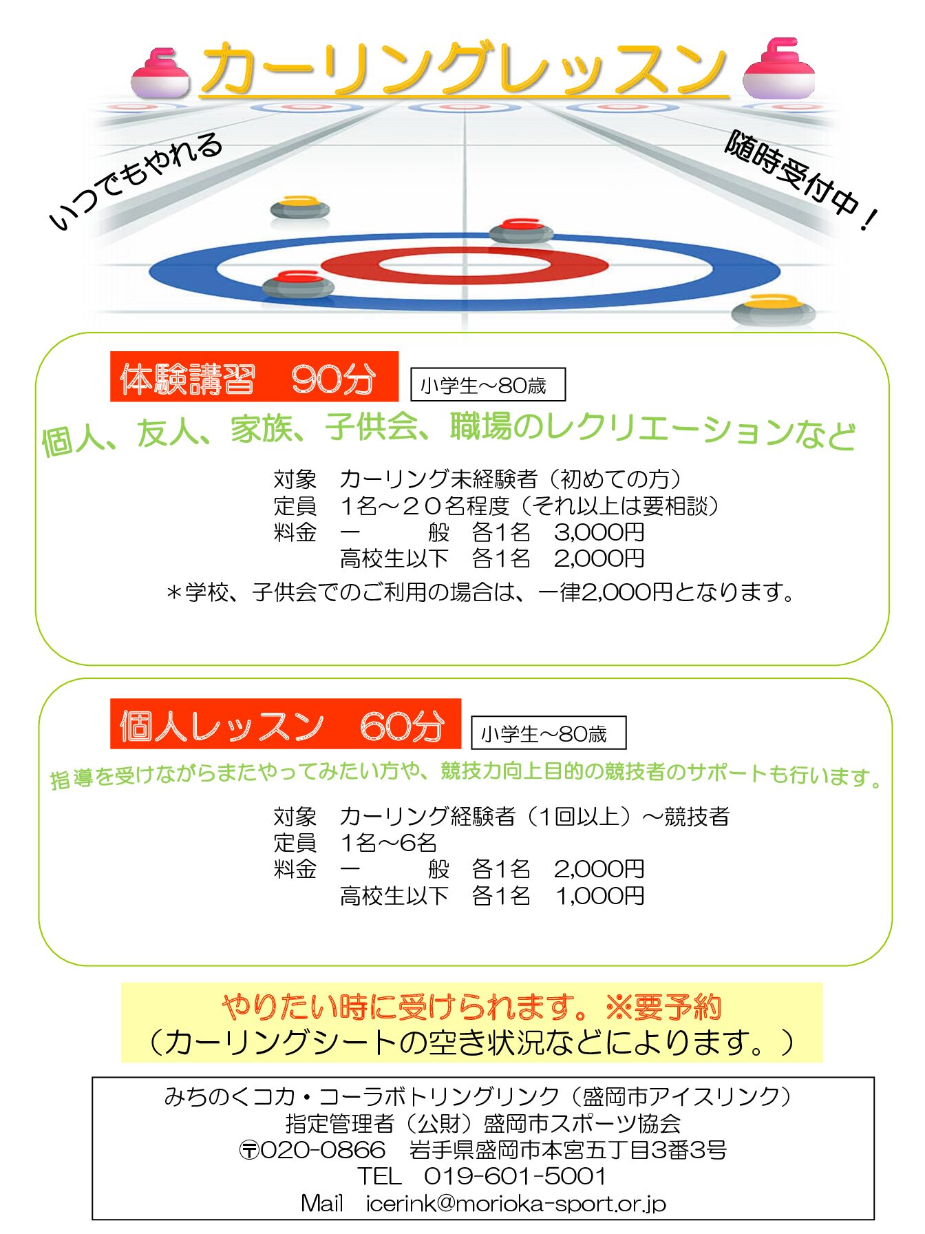 | 講師 | 苫米地 美智子、 東本 浩昌 、他職員 (盛岡市アイスリンク職員:公認カーリング指導員) |