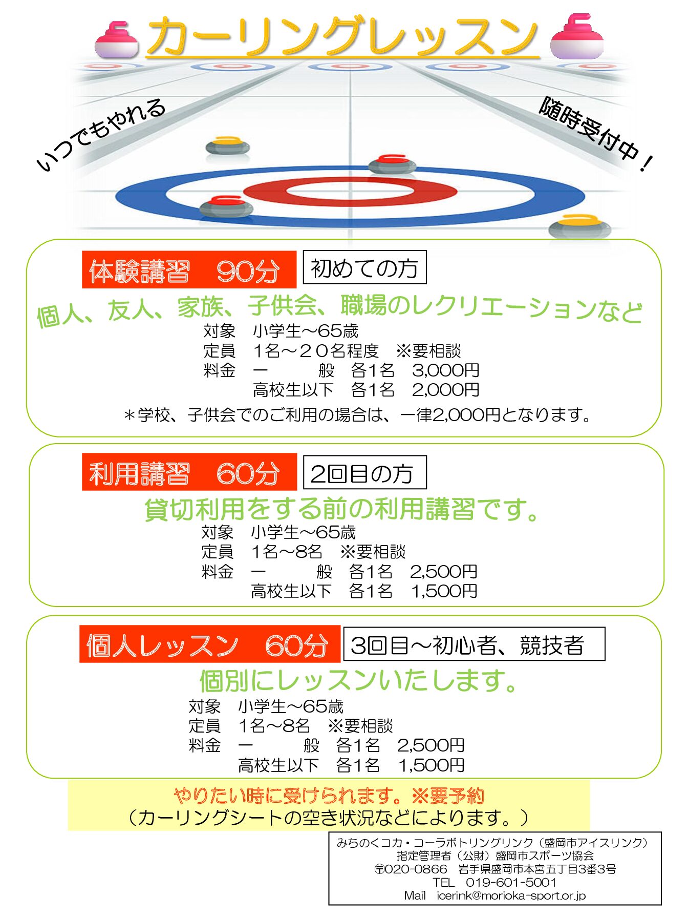 | 講師 | 苫米地 美智子、山口 和人、東本 浩昌(盛岡市アイスリンク職員:公認カーリング指導員)、他職員 |