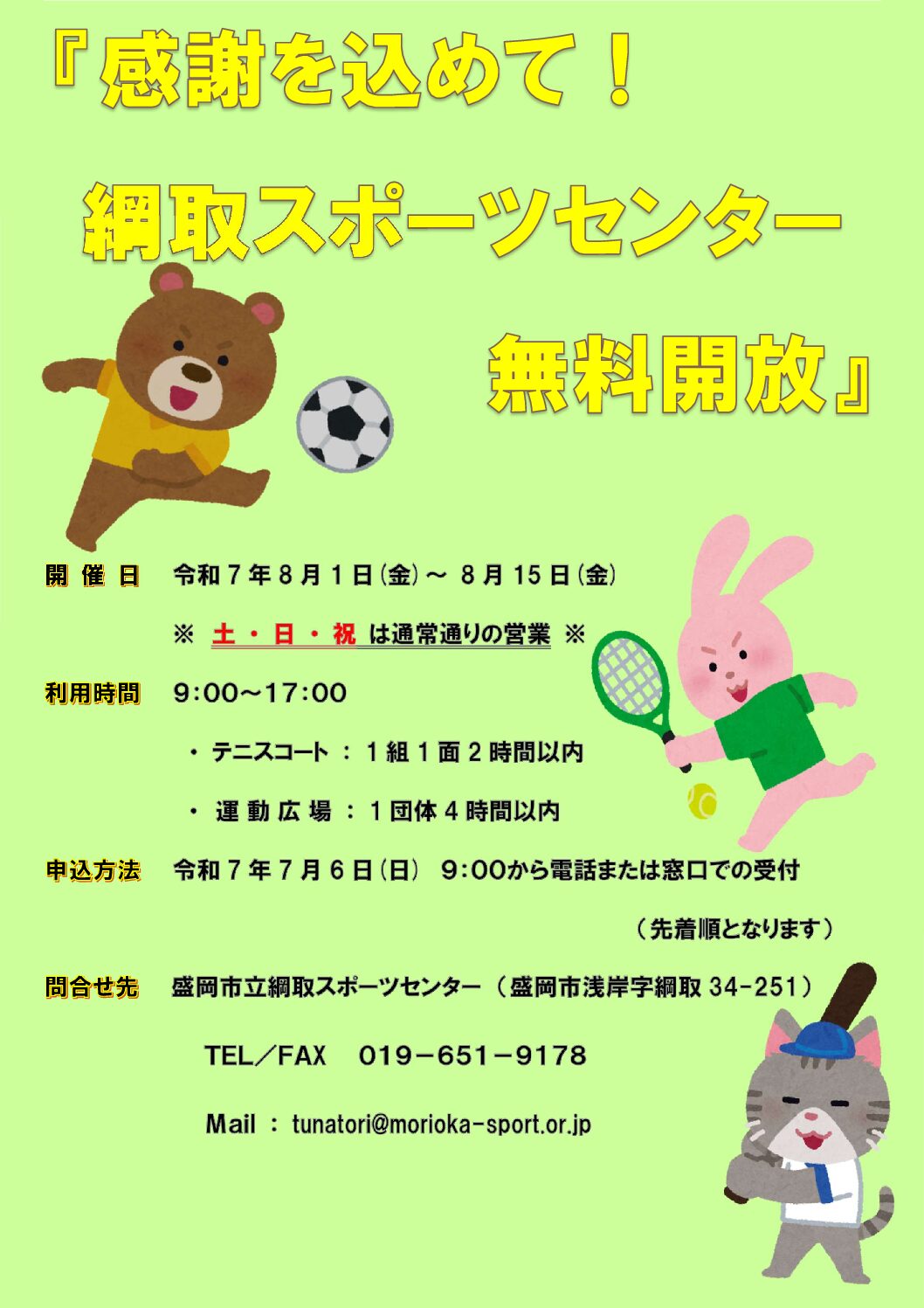 | お申込み | 令和7年7月6日(日)から受付 電話または窓口での受付 TEL 019-651-9178 |